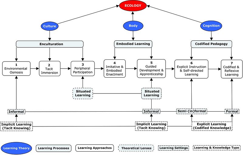 The diagram represents Cuban music learning as a multiscale ecology, integrating processes unfolding across cultural, embodied, and cognitive dimensions. It traces a progression from enculturation-based learning processes (environmental osmosis, tacit immersion, and peripheral participation), through those characterized by embodiment (imitative and embodied enactment, and guided apprenticeship), and into forms of codified pedagogy – ranging from explicit instruction and self-directed learning to codified and reflective practices.